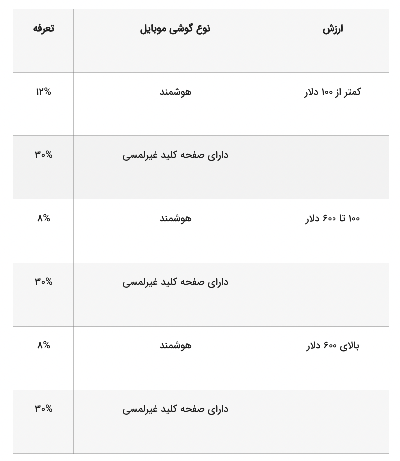 تعرفه واردات گوشی مسافری به ارزش گوشی بستگی دارد. در جدول زیر تعرفه واردات گوشی از خارج از کشور را لیست کردهایم: