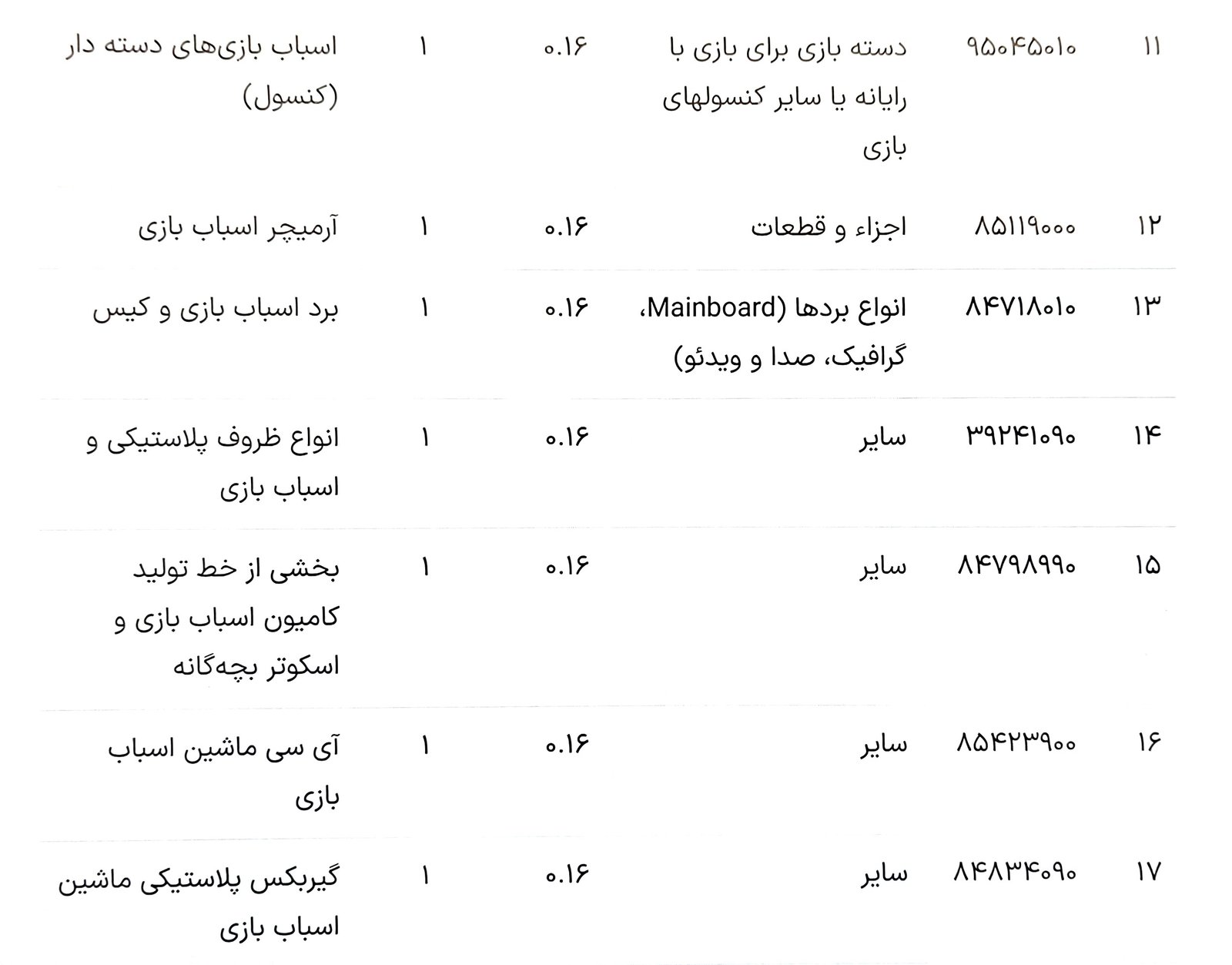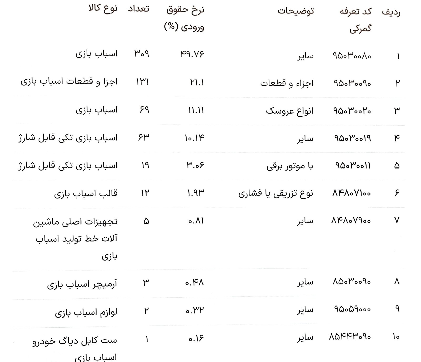 در زیر جدولی از کدهای تعرفه گمرکی و اطلاعات مرتبط با انواع اسباب بازیها و اجزای آنها ارائه شده است: